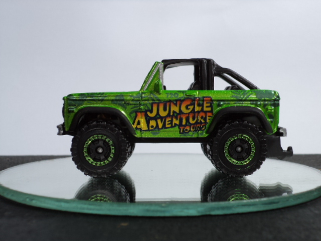 Este Ford Bronco es de Matchbox escala aprox. de 1:64, los colores son "llamativos", especialmente el verde, pero regulares en los vehículos reales que aun circulan por las calles o en off road. El celeste es de un blister individual y el verde es de un pack 5 de 4x4s del 2012. Ambos tienen algunos detalles hechos en luces, mascara y tapabarros.